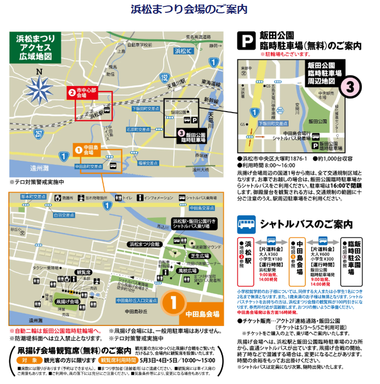 浜松駅発と飯田公園発の有料シャトルバスがあり、始発は9:00、浜松駅・飯田公園からの終発は14:00、中田島会場からの終発は16:00です。